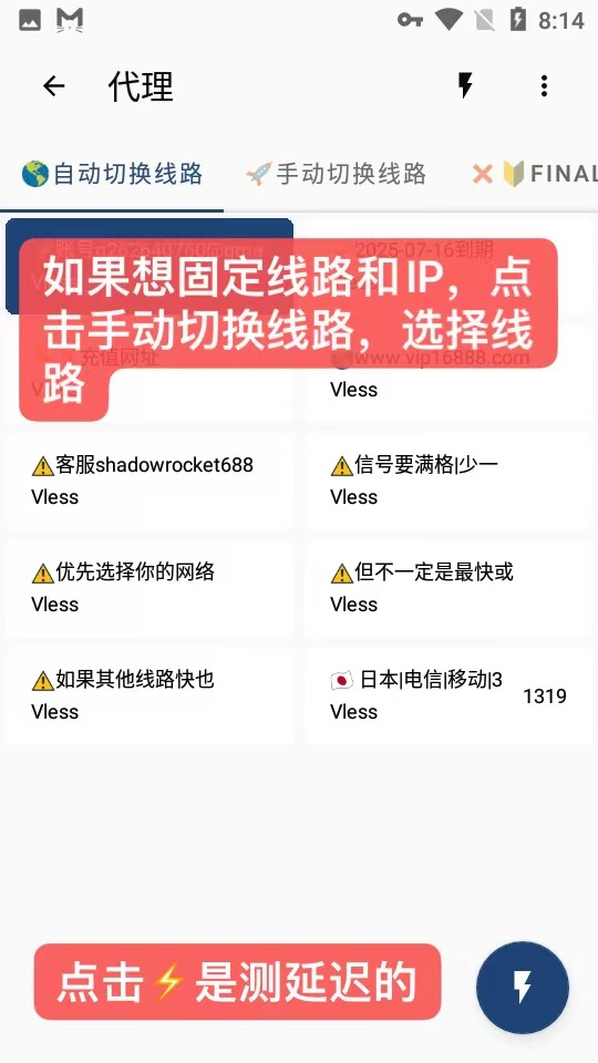1.如果想手动选择线路和固定IP,请点击APP首页的代理进去。