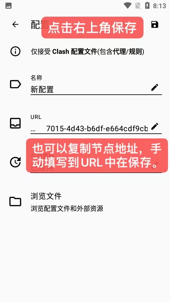 如果没有弹出APP,也可以手动复制订阅地址,然后到Clash APP首页—>配置—>右上角添加配置—>填写URL——>然后右上角保存。