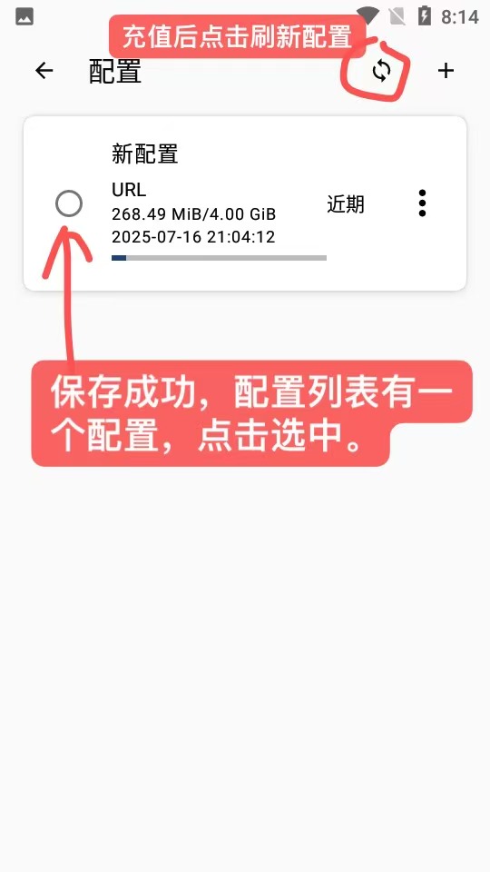 用不了或者充值后,可以点击配置列表,右上角刷新配置(前提是需要关闭APP首页的运行状态,需要处于【已停止】状态,才可以刷新配置。)