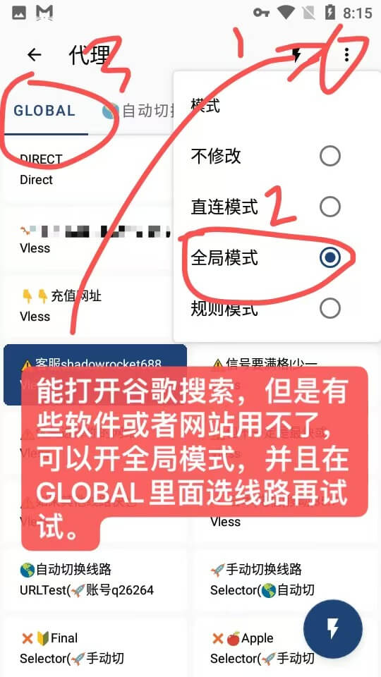⚠️⚠️全局模式:选这个就是手机上所有软件都是走国外网络,国内的软件和国内网站使用就会很卡。
